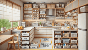 キッチン内を「調理ゾーン」「洗い物ゾーン」「盛り付けゾーン」に分けておくと、どこに何を置くか迷わなくなります。ゾーンごとにカゴやトレーで区切るとスッキリ見えますよ。さらに、ゾーン分けを細かくすることで効率が上がります。例えば調理ゾーンの中でも「下ごしらえ用」「調味料」「カトラリー」など、細かく仕分けておくと必要なものにすぐ手が届きます。使用頻度が高いものは腰の高さに、重い鍋などは下段に置くなど、体の負担を考えた配置を意識しましょう。また、定期的に不要品を見直すことで、常に使いやすい空間をキープできます。