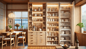 さらに、ガラス扉の中にはライトを取り付けると、食器の美しさが際立ち、夜でもやわらかな雰囲気を演出できます。カウンターの高さを利用して季節の花や小物を飾れば、リビングとキッチンの境界が自然に馴染み、空間全体に統一感が生まれます。来客時にはそのままインテリアの一部として楽しめるのも魅力です。