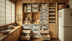 サイズをそろえると見た目がスッキリし、無駄なスペースが減ります。透明タイプなら中身が見えて便利。ラベルを貼ると、何がどこにあるか一目でわかります。さらに、使用場所ごとにボックスの形状を変えると使いやすさがアップします。たとえば、浅めのボックスはカトラリーやコップ用に、深めのボックスはお皿や保存容器などに向いています。素材もプラスチックだけでなく、竹や布製のバスケットを取り入れると温かみのある印象に。インテリアとの調和を意識すると、収納自体が空間のアクセントになります。