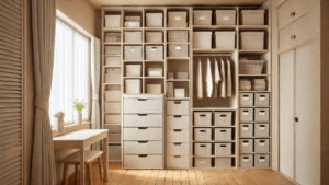 収納家具を選ぶときは、**“置く場所に合うサイズ”**を意識しましょう。サイズが合うと、動線(人の動き)がスムーズになり、取り出すのもラクになります。家具の奥行きや高さもチェックして、部屋全体のバランスを崩さないことがポイントです。