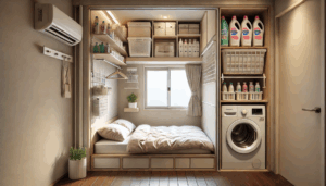 たとえば、ベッド下に収納ボックスを置いたり、クローゼットの上段に軽いものをまとめたりするほか、洗濯機の上に棚を取り付けて洗剤や柔軟剤を置くのも便利です。空間を立体的に使うことで、限られた面積でも使いやすい収納をつくれます。